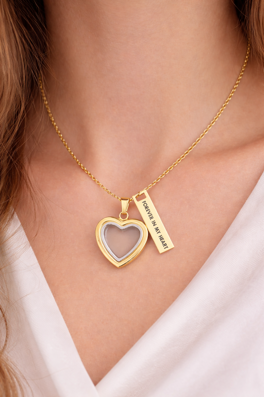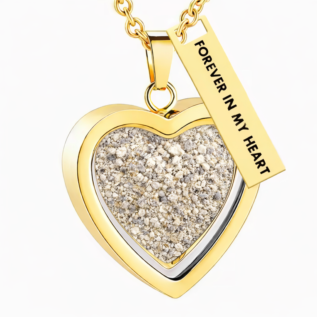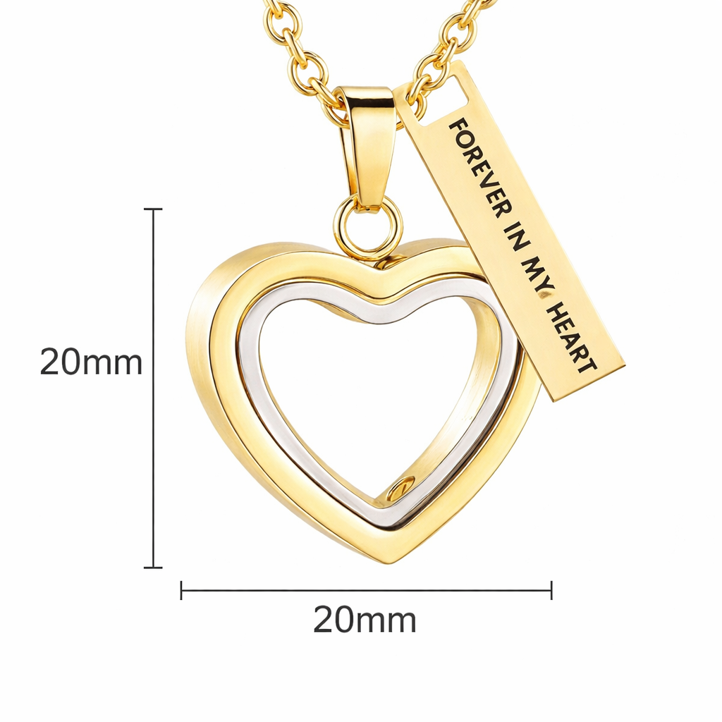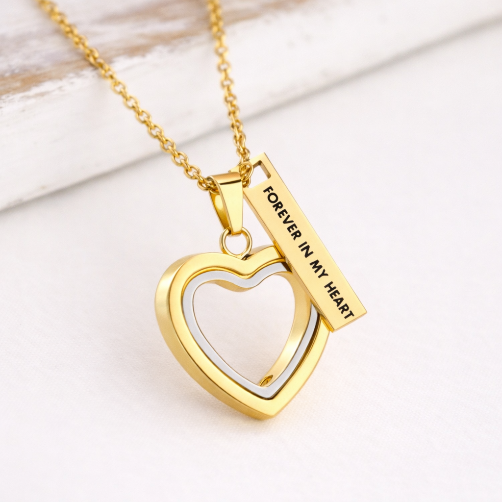 Suspended from a gold chain, the open heart shape represents an everlasting bond, while the accompanying engraved tag adds a gentle reminder that your loved one is always close to your heart. Designed to be worn comfortably at the neckline, this pendant is suitable for everyday wear or special remembrance occasions.